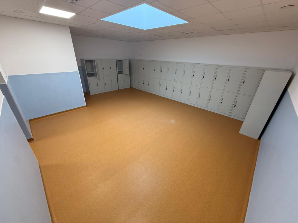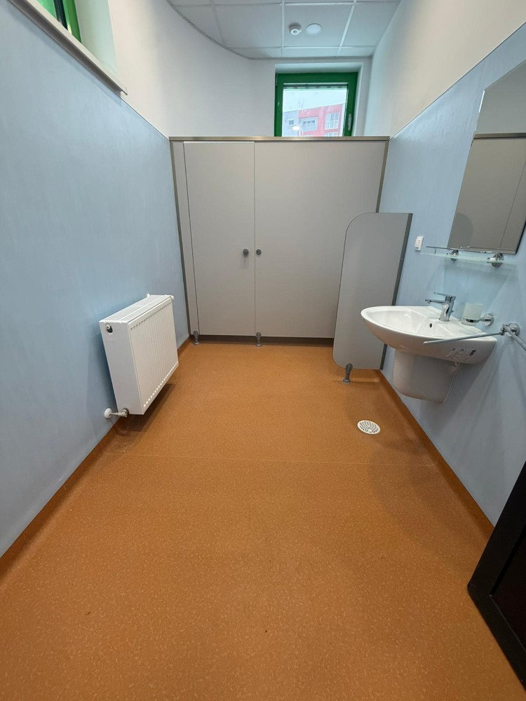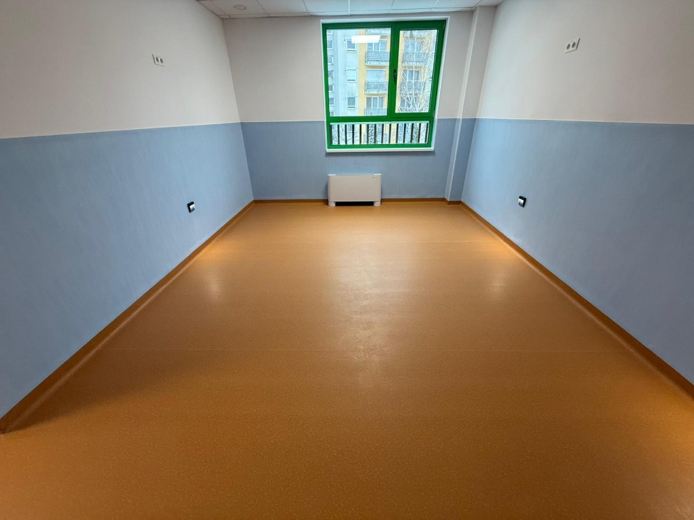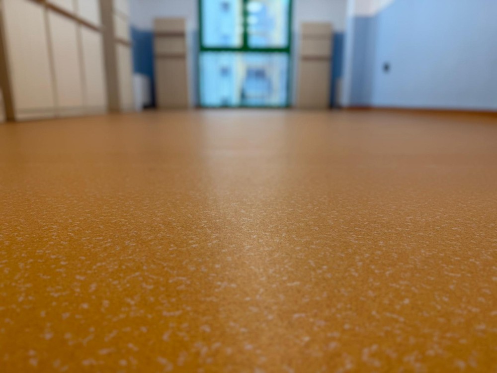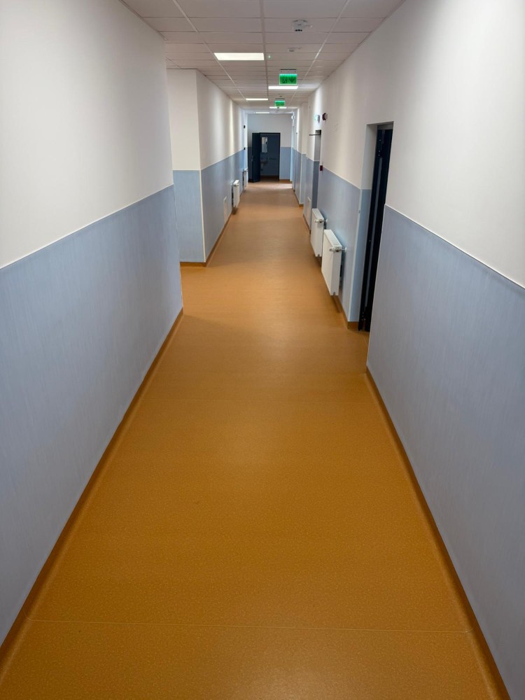 Pentru pardoseli am montat covor PVC Tarkett model Spark A08 pe o suprafață de 1500 mp, un material eterogen de 2 mm grosime, rezistent la uzură și ușor de curățat, ideal pentru spații educaționale. Pentru protecția și igienizarea pereților am aplicat tapet PVC Tarkett model Wallgard Strong Pastel pe o suprafață de 1560 mp, un sistem antibacterian, impermeabil și foarte durabil, potrivit pentru zone în care curățenia și siguranța sunt esențiale.